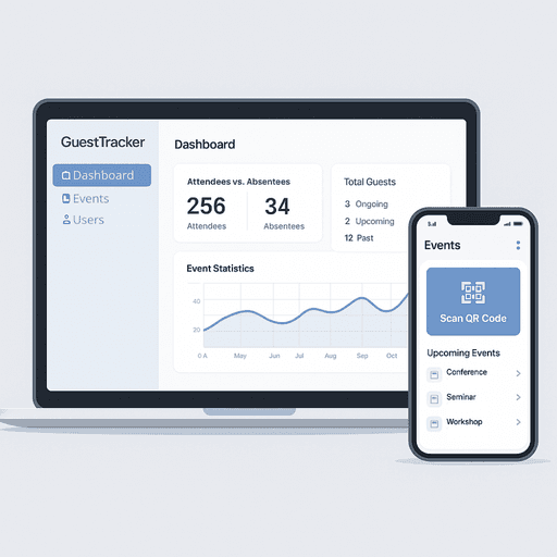 The administrative web application allows for event creation, guest list management, and the sending of email invitations containing personalized QR codes and accompanying documents. It also provides access to event statistics and real-time attendance monitoring.